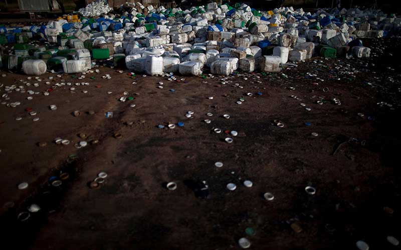 در این عکس که در ۲۳ سپتامبر ۲۰۱۳ گرفته شده، ظروف پلاستیکی سموم برای بازیافت در یک اتاقک در مرزعهای مربوط به یک شرکت کشت سویا در «گوآلاگوآی چو» در استان انتره ریوس انبار شده است. دستورالعملهای متعدد وزارت بهداشت آرژانتین استفاده از ظروف پلاستیکی سموم را در چرخه بازیافت به خاطر بروز مشکلات سلامتی مردم به شدت ممنوع کرده است. این شرکت تولید سویا میگوید این ظروف پس از بازیافت در صنعت تولید لوله پلاستیکی استفاده میشود.