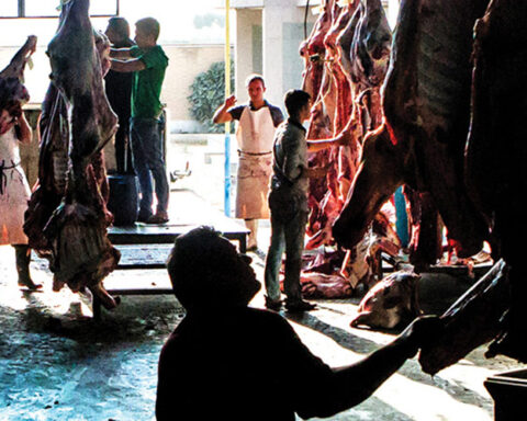 ادامهسلاخها، چاقوبهدست، ایستادهاند. گاوها و گوسفندها از مخزنی سرپوشیده بهردیف جلو میآیند تا برسند به پایان عمر. شوکزن الکتریکی اولین ضربهی مرگ را وارد میکند بر تن چاق حیوان و بدنش را بیحس میکند. دستگاه پاها را میبرد بالا. سر درست میافتد جلو دست سلاخ. سَرسلاخ فرمان کشتار را صادر…