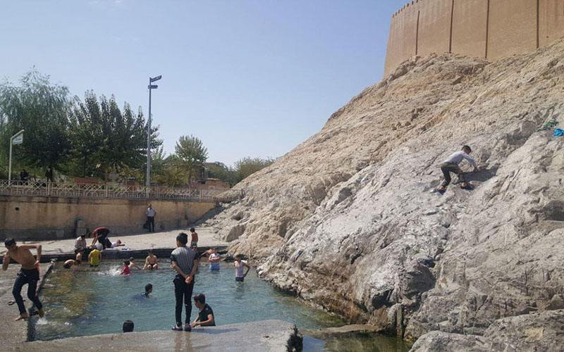 چشمهعلی هشتهزارسالهی شهرری دو سرچشمه دارد؛ یکی در شمال کتیبهی قاجاری فتحعلیشاهی است و دیگری در جنوب آن. امروز یکشنبه، ۲۶ شهریور، سرچشمهی جنوبی کتیبه پرآب است. بچههای چشمهعلی هم در آخرین روزهای شهریوری تن به آب زدهاند. چشمهی شمالی اما کمآب است، بعضی جاهای آن هم خزه بسته که نشان از رکود آب دارد ولی امروز آب در آن جریان دارد. صدای هیاهوی شناگران همهجا پیچیده و حتی عدهای در بخش جنوبی شیرجه میزنند. اما آیا دیروز چشمهعلی خشک شده بود؟